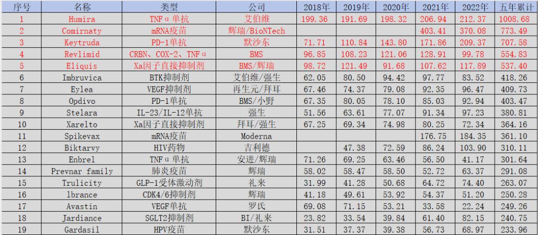 为了搞清楚这个问题,我们全面复盘了2018-2022年的明星药物销售情况。经统计,艾伯维的TNFα单抗Humira(修美乐)的累计销售额突破千亿美元,遥遥领先于其他明星药物,成为药王之王。