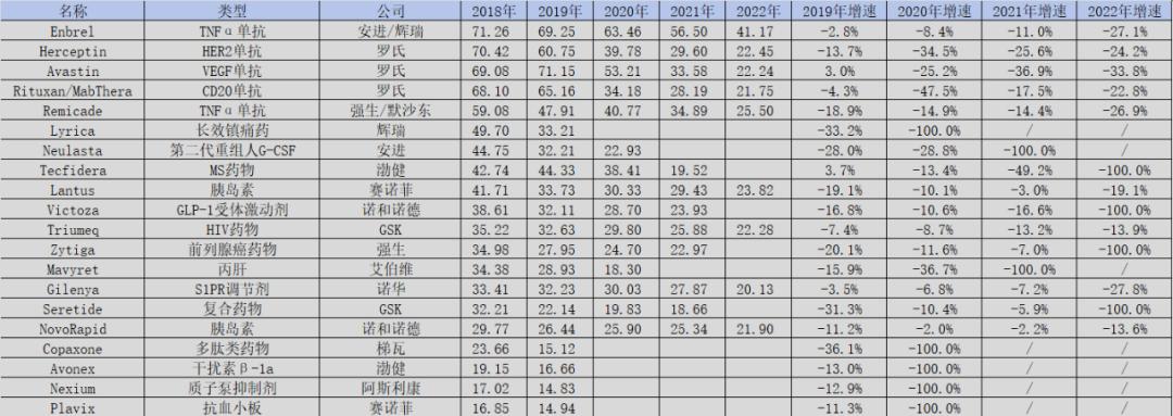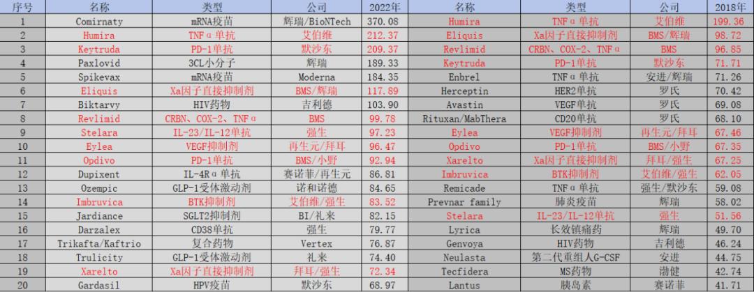 图:2018年和2022年全球药物销售排名TOP 20对比,来源:锦缎研究院