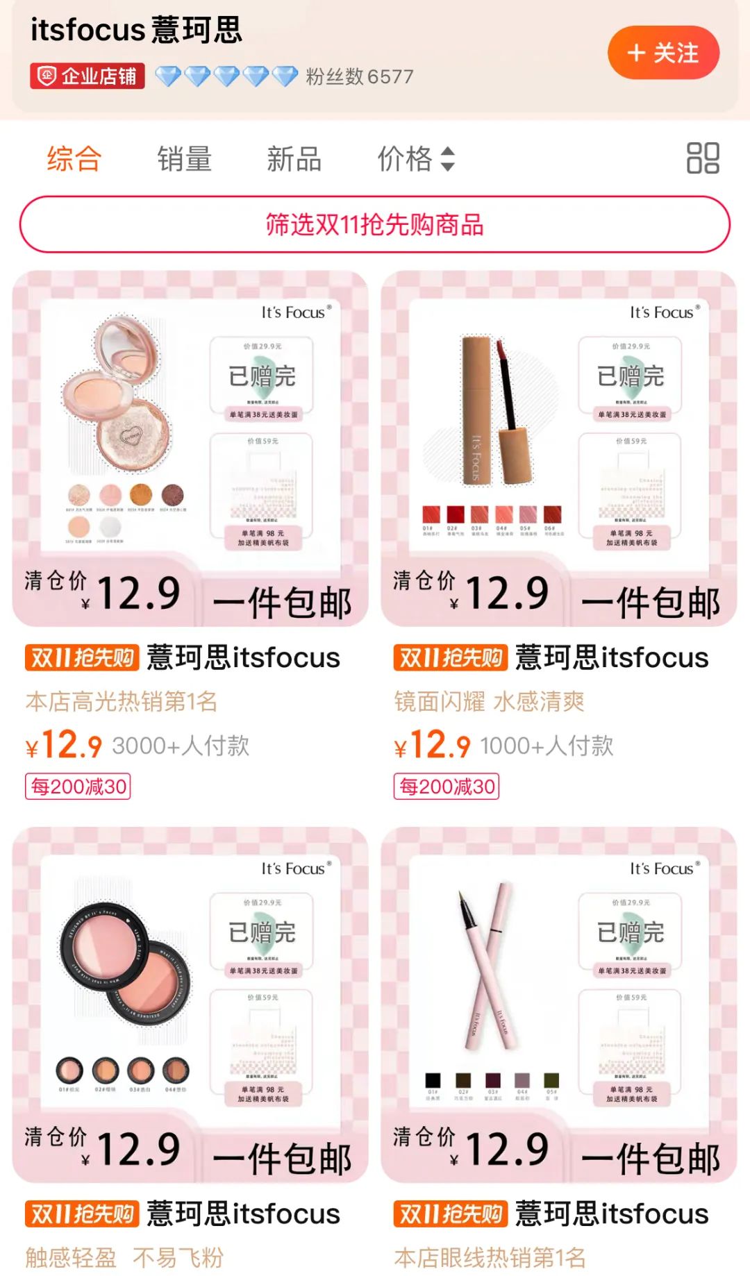闭店公告发出后,有网友表示惋惜,也有消费者选择去店铺购买产品表达对品牌的支持。截至发稿,淘宝企业店铺itsfocus薏珂思粉丝数为6496,店铺在售的眼影、腮红、唇釉和眼线笔目前都以12.9元的价格清仓,其中最畅销的单品为It's Focus糖心提亮粉饼,已售6000多件。