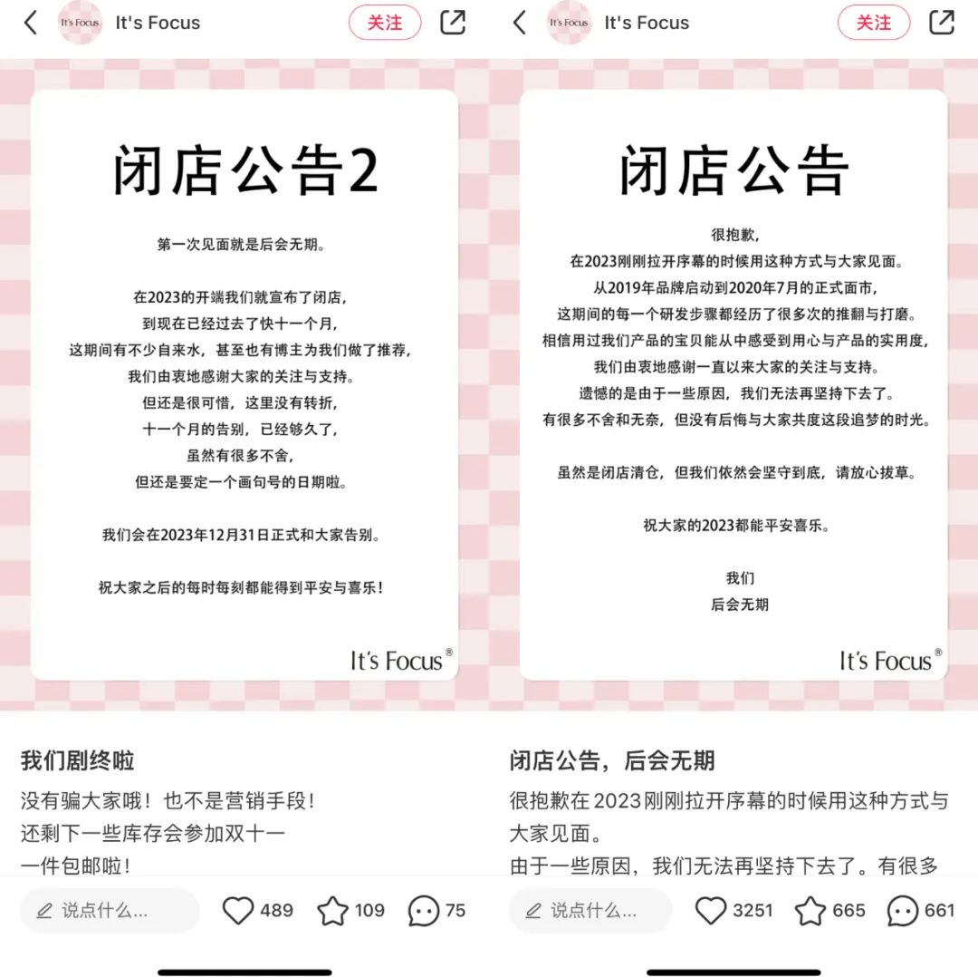 但这波热度并未能改变lt's Focus薏珂思的命运。近日,itsfocus薏珂思品牌发布《闭店公告2》,明确品牌将在2023年12月31日正式和消费者告别,并表示“没有骗大家,也不是营销手段,还剩下一些库存会参加双十一”。也就是说,面市不足4年,lt's Focus薏珂思将正式关停,退出市场。