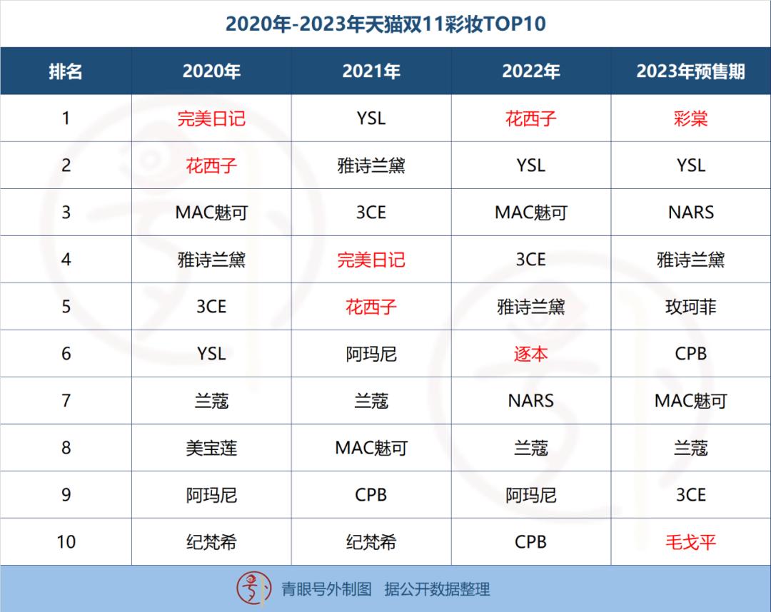 在经历了一场新锐品牌“大逃杀”后,国内彩妆市场也出现了新变化。结合近4年天猫双11彩妆TOP10品牌榜单来看,国货彩妆品牌已经出现了新的轮替。从2020年完美日记、花西子独占鳌头,到2022年花西子摘得第一,逐本入榜,到今年,国内两大化妆师品牌彩棠和毛戈平成为前十中唯二的国货品牌。