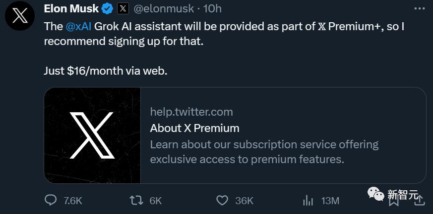 马老板也官宣了Grok的早期获取方式——订阅「 𝕏 Premium Plus」,每月只要16刀。不过现在还是处于灰度测试阶段,等到测试完毕,订阅用户才能全面可用。