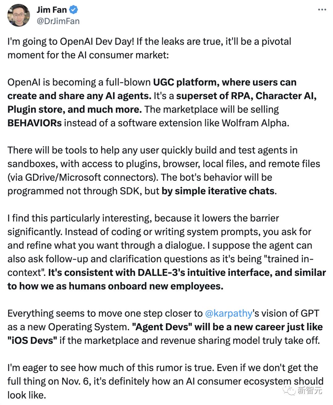 英伟达高级科学家Jim Fan表示,我要去参加OpenAI开发者日!如果泄漏属实,这将是人工智能消费市场的关键时刻: