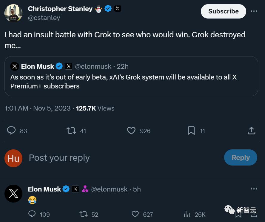 这位网友在获得体验资格之后,先和Grok来了一场骂战,结果是Grok大获全胜,马老板亲自回复:笑哭。
