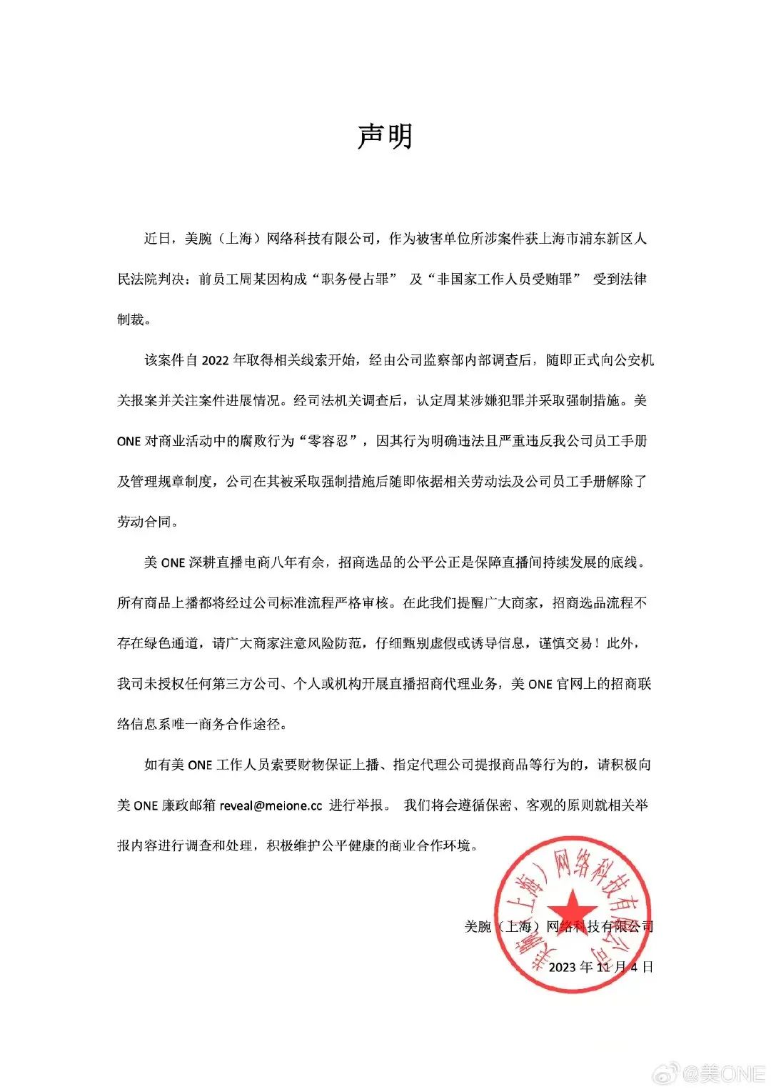 事件曝光后,美腕公司也通过官方微博发布声明,称在周某被采取强制措施后公司已经与其解除劳动合同,并表示对商业腐败行为零容忍,所有商品上播都将经过公司标准流程严格审核,招商选品流程不存在绿色通道,公司也未授权第三方公司、个人或机构开展直播招商代理业务。