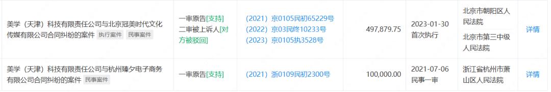 据企查查信息显示,美学公司还曾因直播带货合作与杭州臻夕电子商务有限公司(下称:杭州臻夕)、北京冠美时代文化传媒有限公司(下称:北京冠美)发生纠纷。