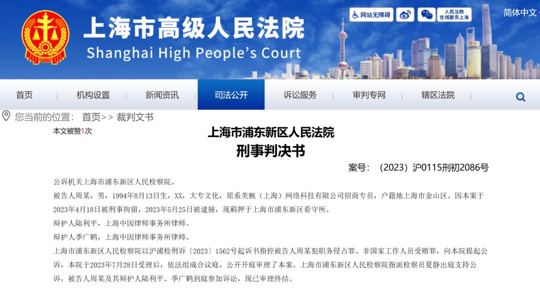 据公开的刑事判决书显示,被告人周某曾在美腕公司担任招商专员一职,负责与商家进行商务合作谈判、商品选送、合同签订、排期沟通等工作。