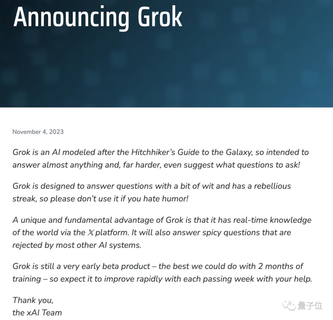 而在背后提供支持的模型也叫Grok,目前基于的是Grok-1版本,它的原型Grok-0在xAI宣布成立后开始训练。