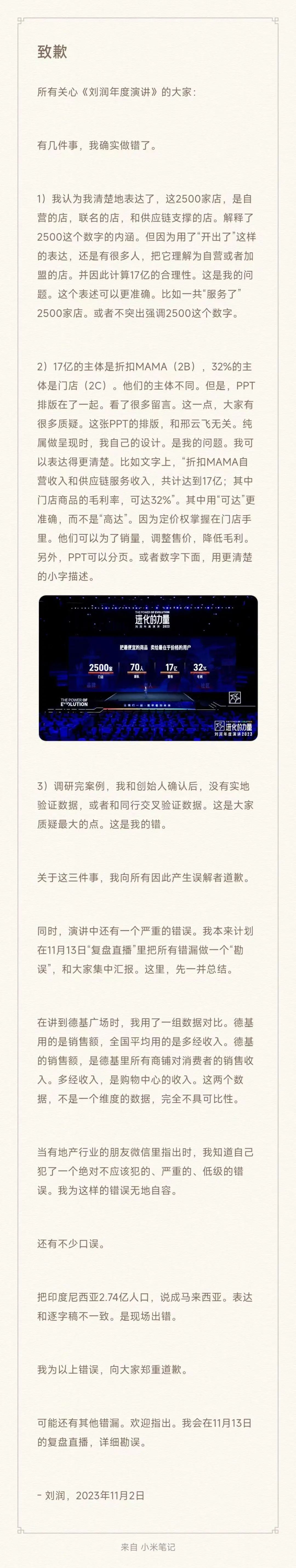 10月30日,刘润再次发文称,这样规模的演讲,怎么可能不经证实,在网上查一查,就随口乱说。整段案例,和每一个数字,都是经过折扣MAMA创始人邢云飞确认过,才敢上大屏。中间有微调,还要再次确认。直播和全文搞里都有很清楚地说,这2500家店,包括:直营的店,联名的店,和供应链支撑的店。中间有2C也有2B的部分。