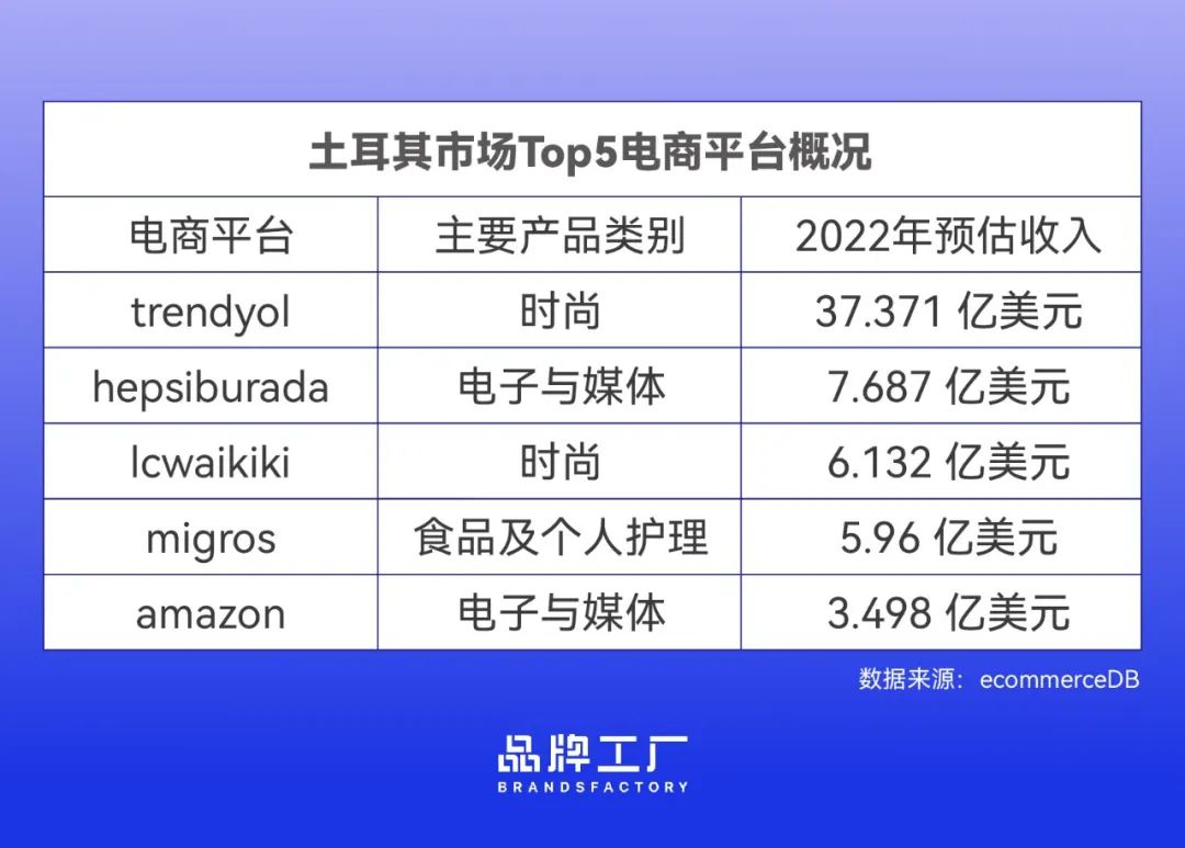 不过,外来者并未成为土耳其电商市场的称霸者,ecommerceDB数据显示,2022年,土耳其电商平台排名中,排名前三的Trendyol、Hepsiburada、lcwaikiki都是本土平台,合计占据了土耳其百强电商平台总市场份额的51.5%,亚马逊土耳其站排在第五。