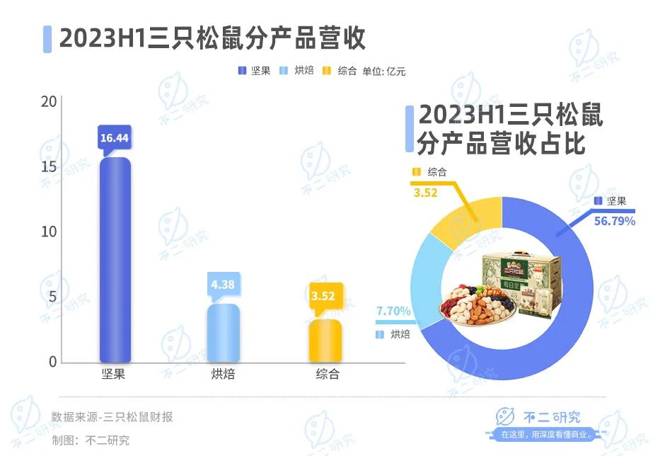 在品牌的IP化中,三只小松鼠分别代表坚果、花茶、干果类产品。其2023年半年报显示,混合坚果贡献了56.79%的销售额,同比下降30.50%。