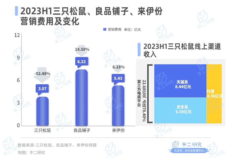 2023半年报显示,三只松鼠近8成营收来自于线上渠道,推广费及平台服务费为3.07亿元,同比减少52.48%。