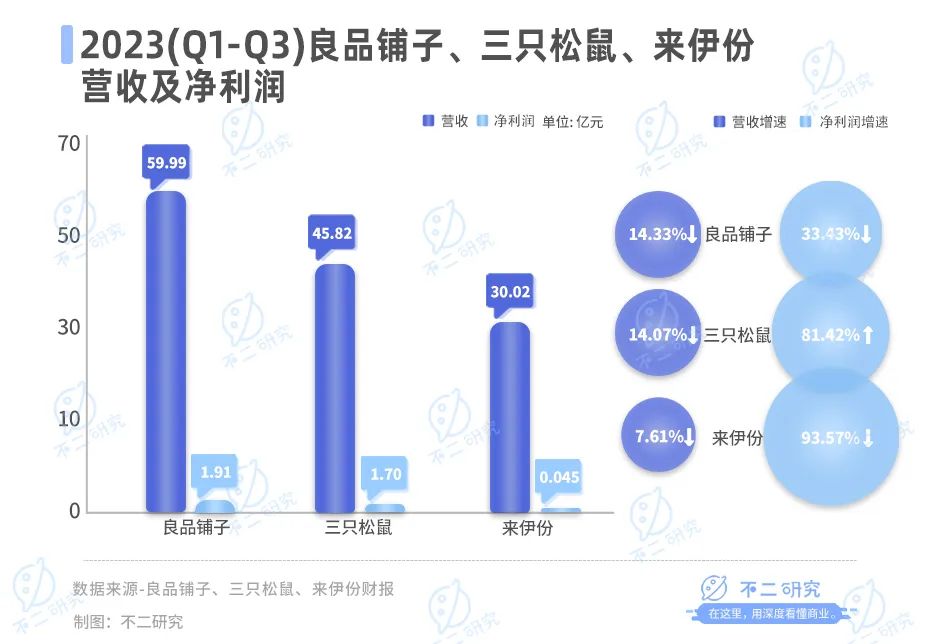 具体来看,2023年三季报数据显示,良品铺子营收59.99亿元,同比减少14.33%;三只松鼠实现营收45.82亿元,同比减少14.07%;来伊份营收30.02亿元,同比减少7.61%。