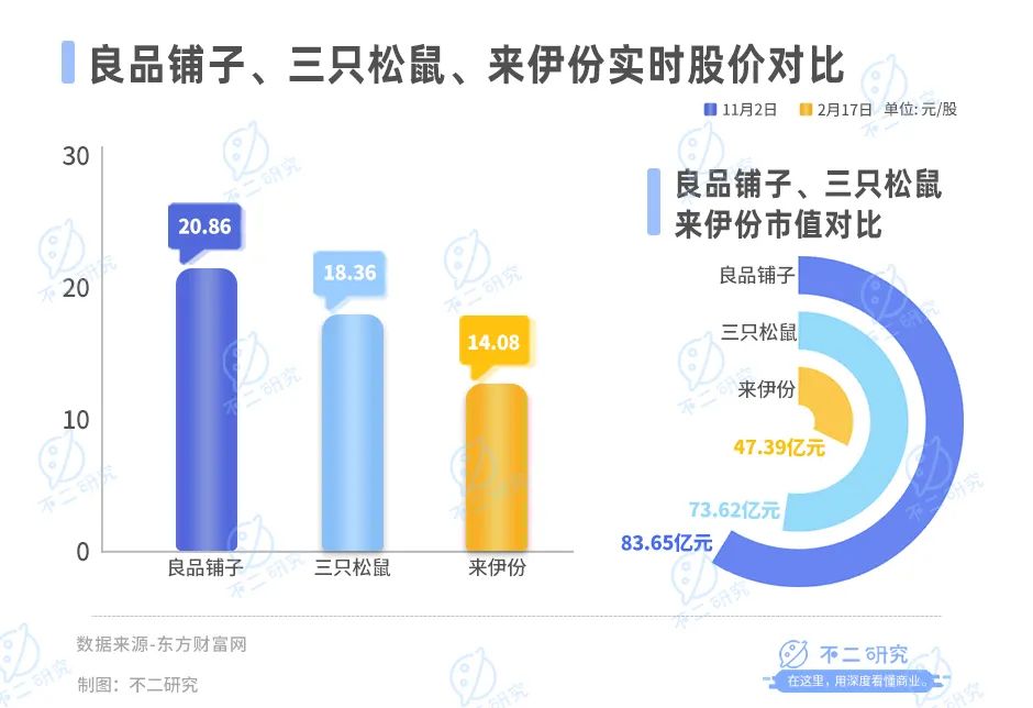 截至11月6日收盘,良品铺子报收20.86元/股,对应市值83.65亿元;三只松鼠报收18.36元/股,对应市值73.62亿元;来伊份报收14.08元/股,对应市值47.39亿元。