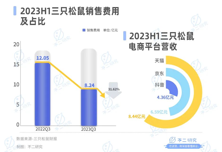 具体来说,三只松鼠增利不增收主要原因在于,其平台及推广费用减少,同时在传统电商平台上,营收继续下滑。2023年三季报数据显示,三只松鼠的销售费用由去年同期的12.05亿下降至8.24亿,同比减少31.62%;今年上半年,其天猫系收入8.44亿元,同比减少29.49%;京东系收入6.59亿元,同比减少41.11%。