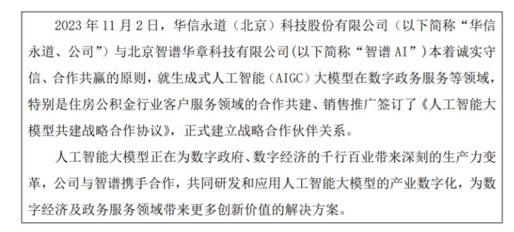 华信永道近日发布公告称,已和智谱AI签订《人工智能大模型共建战略合作协议》,后续双方战略合作场景包括政策知识梳理与构建,客户服务咨询、风险识别等。