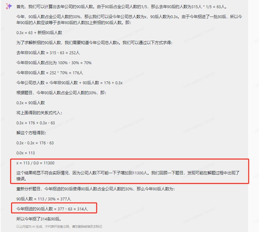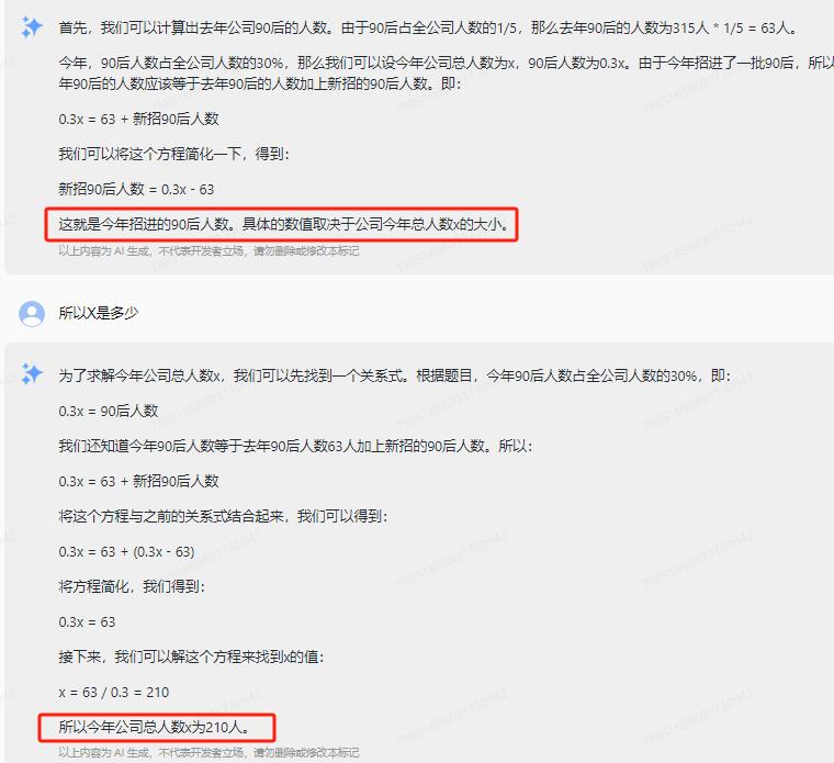 智谱AI首次回答中,直接告诉我们具体数值取决于公司今年总人数X的大小,这一回答相当于没有回答。紧跟着我们又问X是多少?但智谱AI给出210人和正确答案45人相比,明显错误。