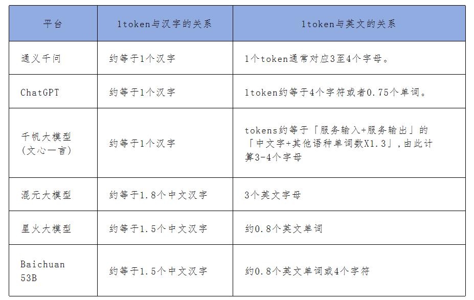 这里的tokens可简单理解为“字”或“词”,目前市场上针对tokens尚缺乏一个完整的标准。通义千问、Chat GPT、文心一言的1token相当于1个汉字,星火大模型和Baichuan53B相当于1.5个汉字,混元大模型则为1.8个汉字,英文上几家大模型企业定义更是千差万别。