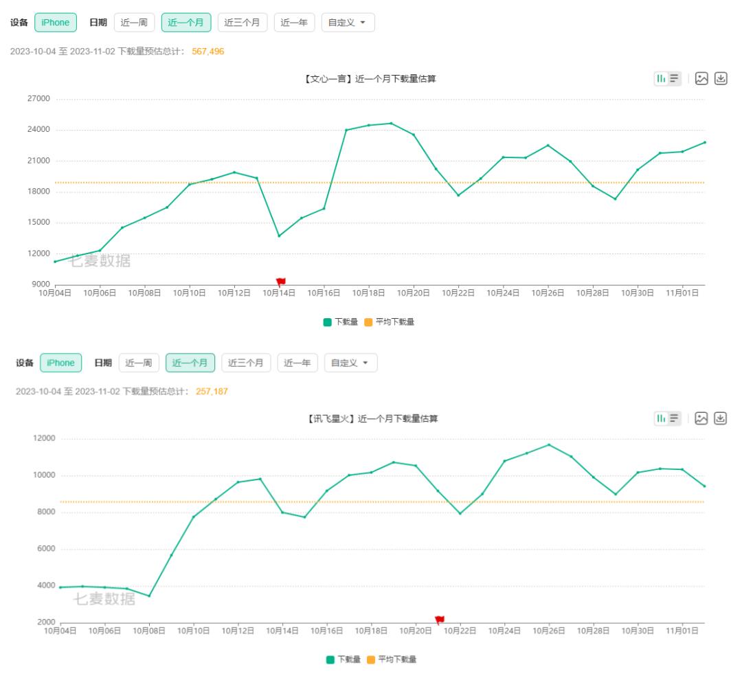 据七麦数据显示,文心一言iOS端、讯飞星火iOS端近一个月日均下载量均在2万以下。同时考虑到APP下载到次日留存、七日留存会存在较大的漏斗模型。显然,当前文心一言和讯飞星火iOS端真实用户数量明显不足。