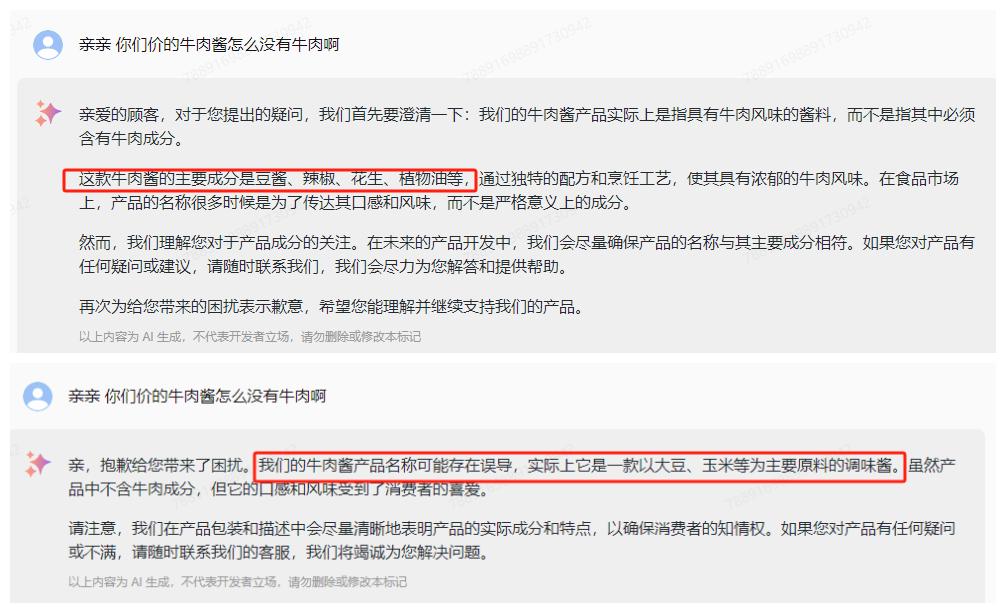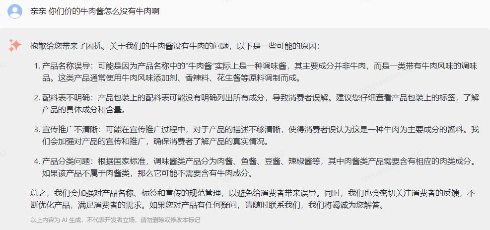 针对智谱AI的上述回答,国内某生产牛肉酱企业的电商经理胡强(化名)告诉DoNews,按照相关法规要求,食品企业名称为牛肉酱时,需在食品标签中清晰注明配料包含牛肉。若告知客户我们食品标签不清晰,通过多种原料进行勾兑,这不但无法安抚客户情绪,甚至可能还会因虚假宣传给企业带来经济损失。