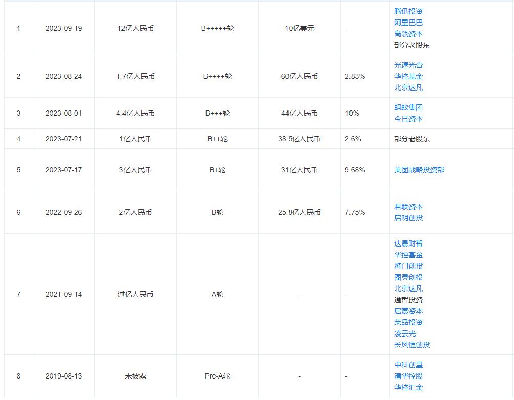 名校光环+爆火的AI,双层buff加持下,智谱AI可谓说是资本眼中的宠儿。今年7月至9月,智谱AI直接拿下5轮融资,企业估值高达100亿元,是国内 AI 领域独角兽企业,其背后的投资方包括美团、阿里、蚂蚁集团、高瓴资本等多家投资机构。