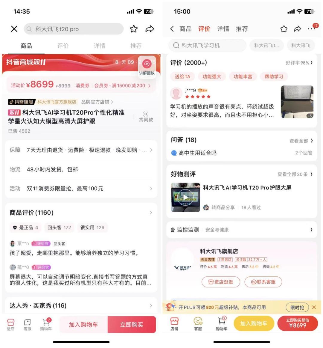 高成本投入下,却是何时盈利的不确定。以搭载大模型实物产品为例,在消费者逐渐被全网最低价教育下,过高的产品售价很容易劝退消费者。仍以科大讯飞T20学习机为例,其8000多元的售价让其在京东平台上评论较少,抖音前端显示销量4000+。但考虑兴趣电商退款率问题,真实销量自然可想而知。降低产品售价,虽能带动销量,但无法覆盖大模型成本。矛盾之下,企业又会如何抉择呢?