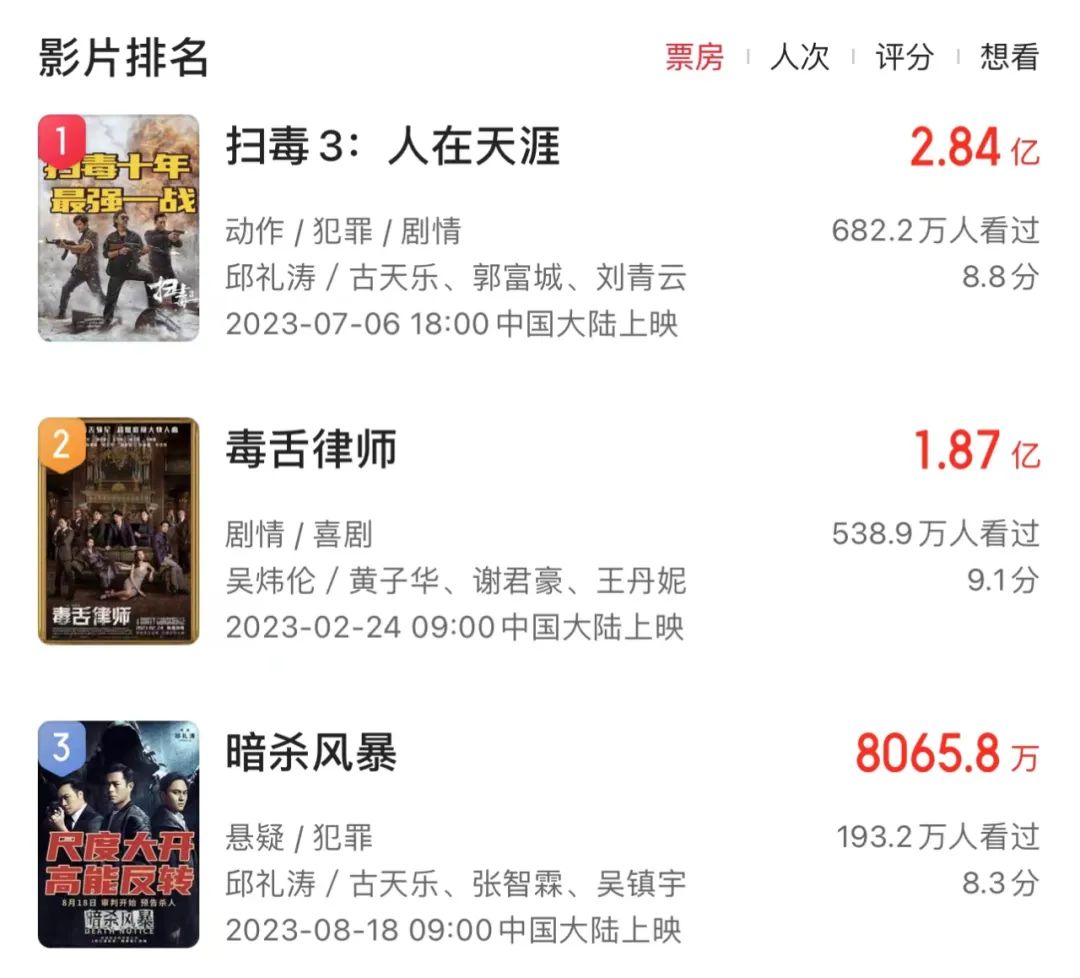 2023年是内地电影市场的复苏之年,但这股暖意却并未吹到港片身上。截至目前,今年上映的港片中只有两部票房过亿。其中,港片票房冠军《扫毒3:人在天涯》作为大爆IP的续作,身处最为热门的暑期档却只拿下2.84亿元的票房数字,成绩实在难言优秀。而另一部破亿的《毒舌律师》,则是一部超出所有人预期的“非典型港片”。