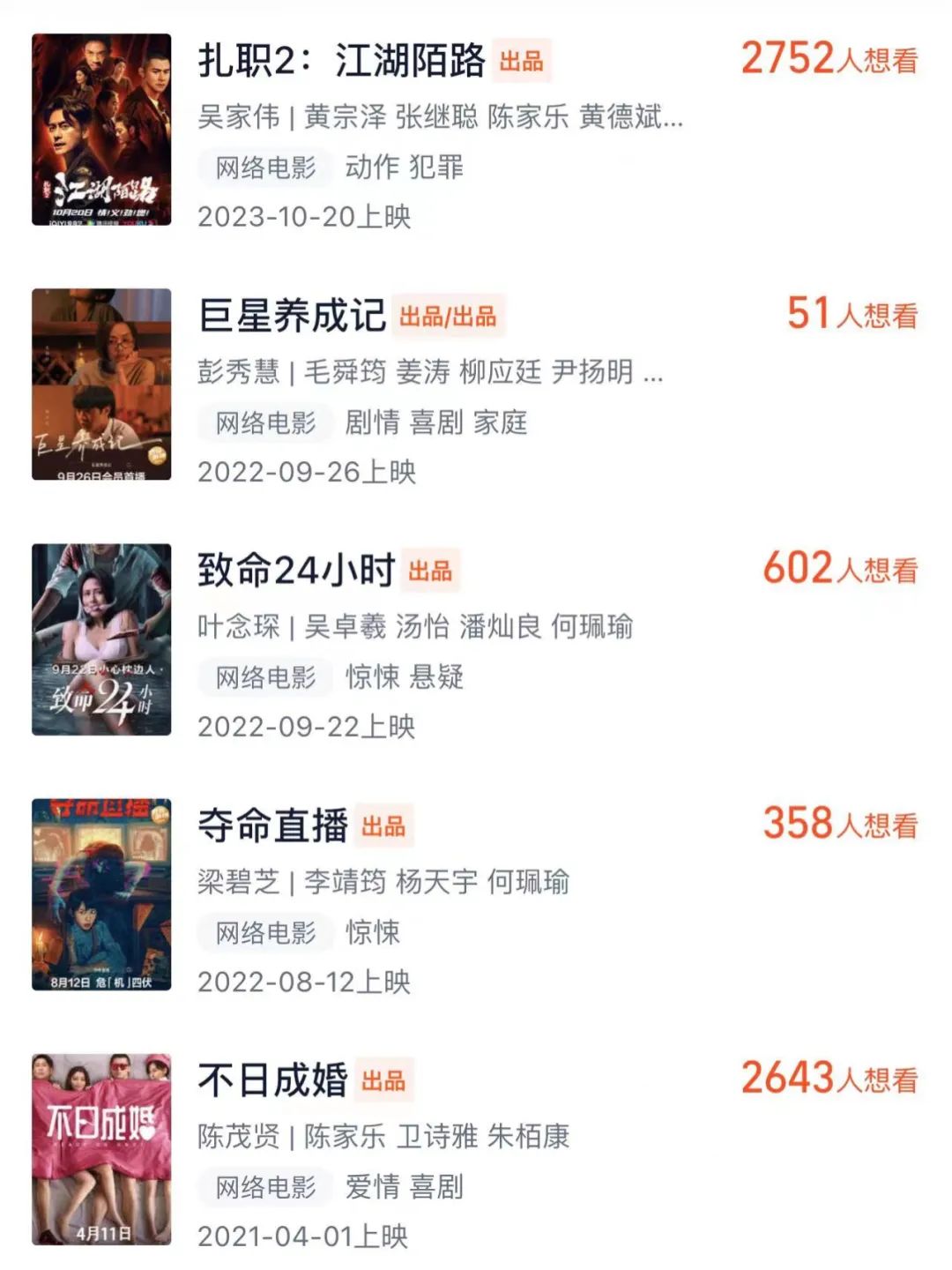 相较英皇过往在内地院线市场投放的项目,选择网络发行的影片普遍体量更小,且在类型上有一些相对细分、小众的题材偏向。这些项目对于内地院线市场而言试错成本相对较高,而更为轻体量的网络发行能够很大程度降低这种上映风险。