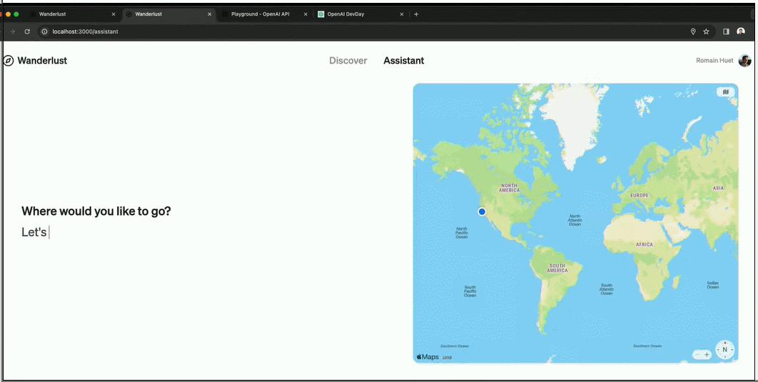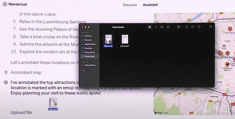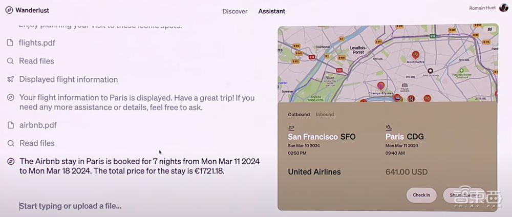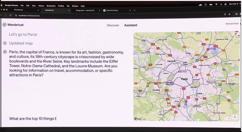 当输入“让我们去巴黎吧!”,该助手自动生成了对巴黎的介绍,并将右侧的地图聚焦到巴黎。