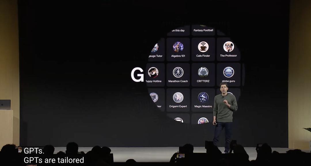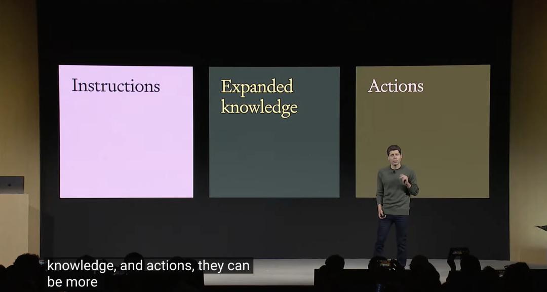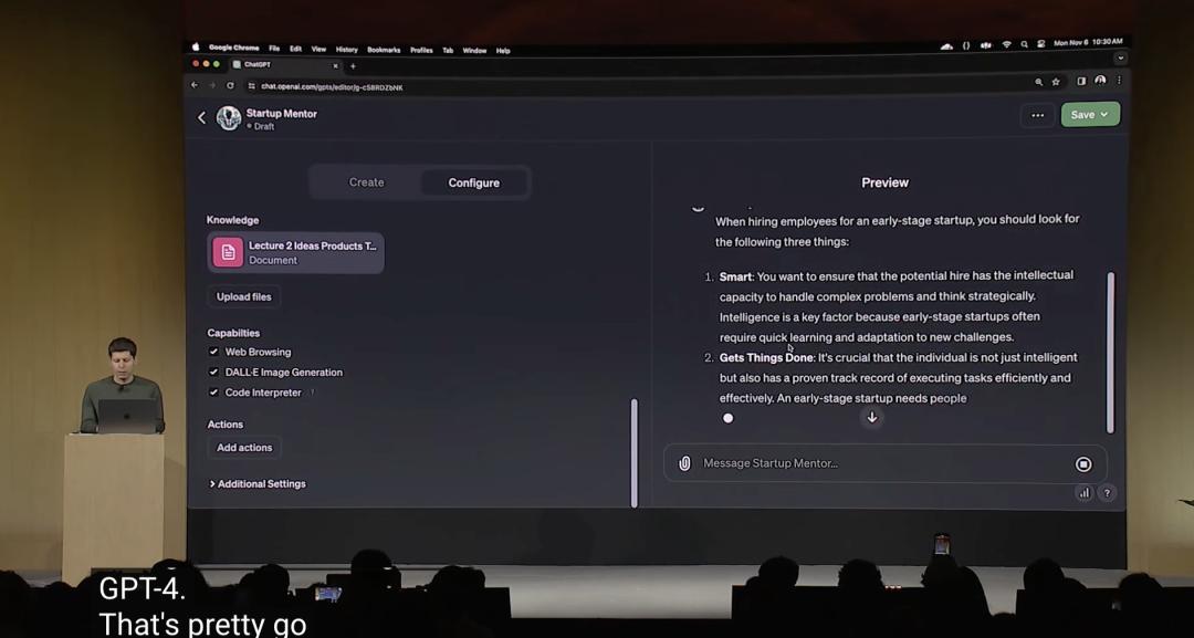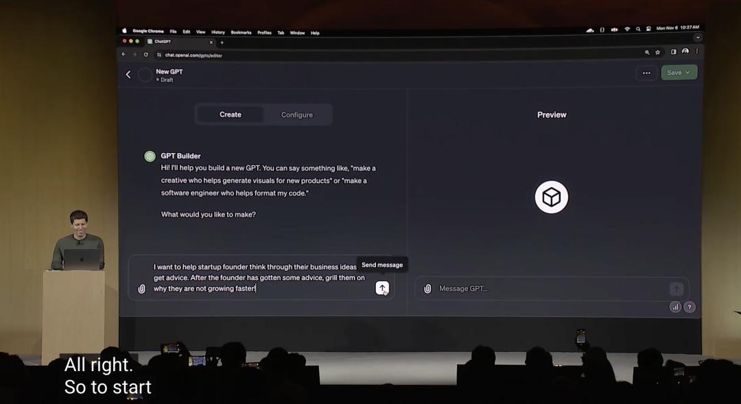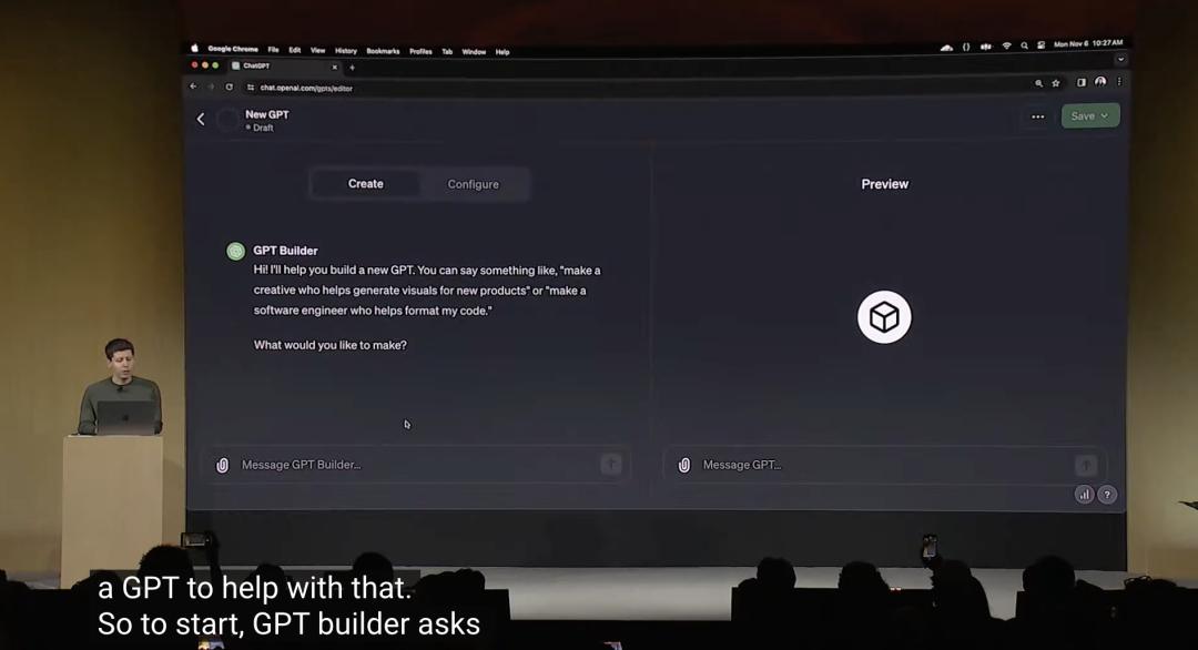 阿尔特曼现场展示了如何使用自然语言,完成ChatGPT构建和分发GPTs,仅仅用了不到5分钟。