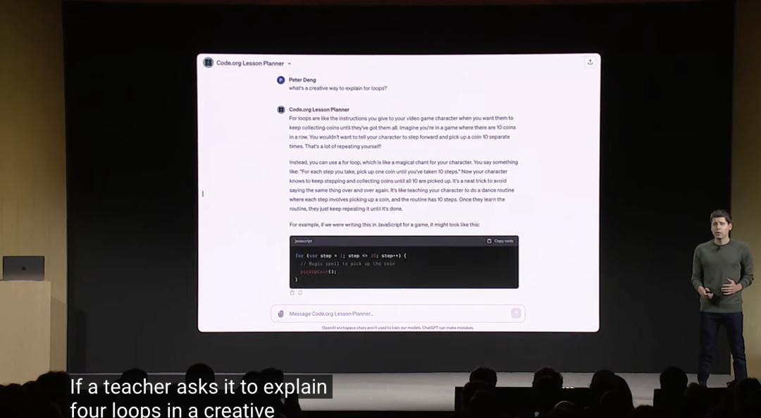 比如,一个教育领域的伙伴Code.org的课程被全球数千万学生使用,其设计了课程策划GPT,汇聚了编程能力和广泛的课程专业知识,让老师能用其帮学生快速解答问题。