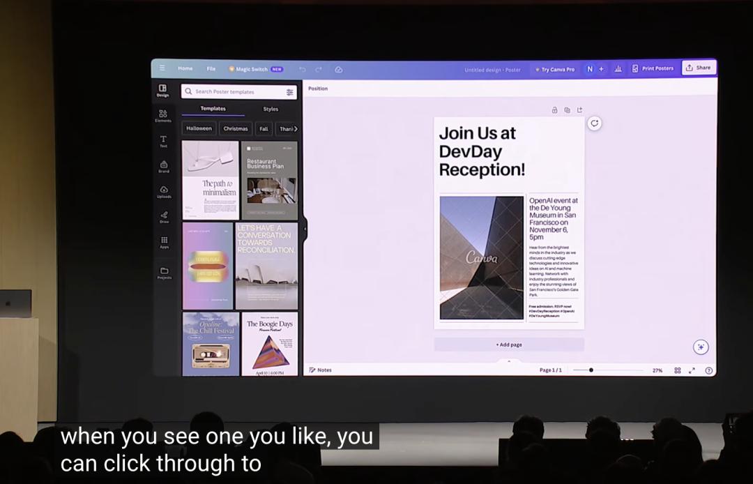 知名设计平台Canva构建了一个GPT,支持用户通过自然语言描述设计需要的素材,比如让它为今天的招待会设计一份海报,定制GPT会根据用户提供的细节生成一些选项,用户通过点击和聊天的方式,就能获得最终设计图。