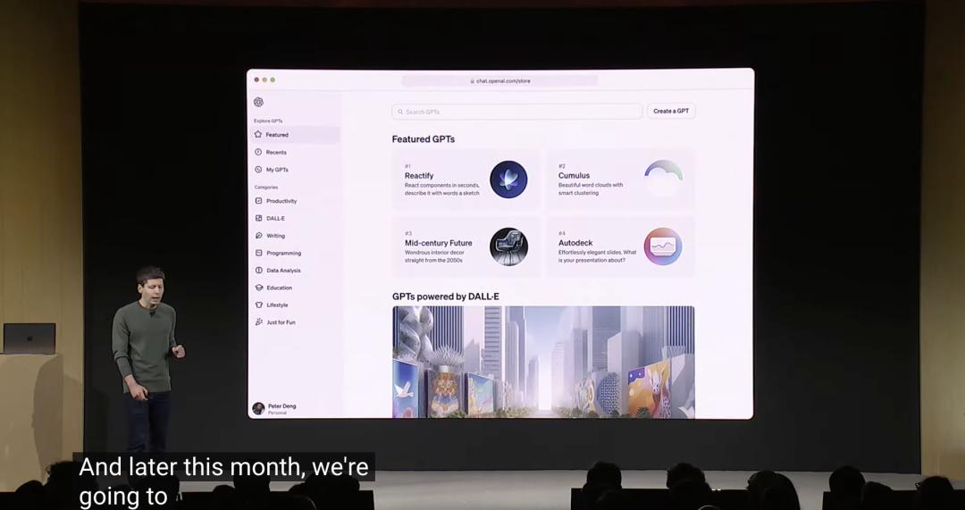 阿尔特曼称,本月晚些时候,OpenAI将推出一个GPT商店,供开发者上传其开发的专业GPT应用,就像App Store一样展示最受欢迎的GPT。