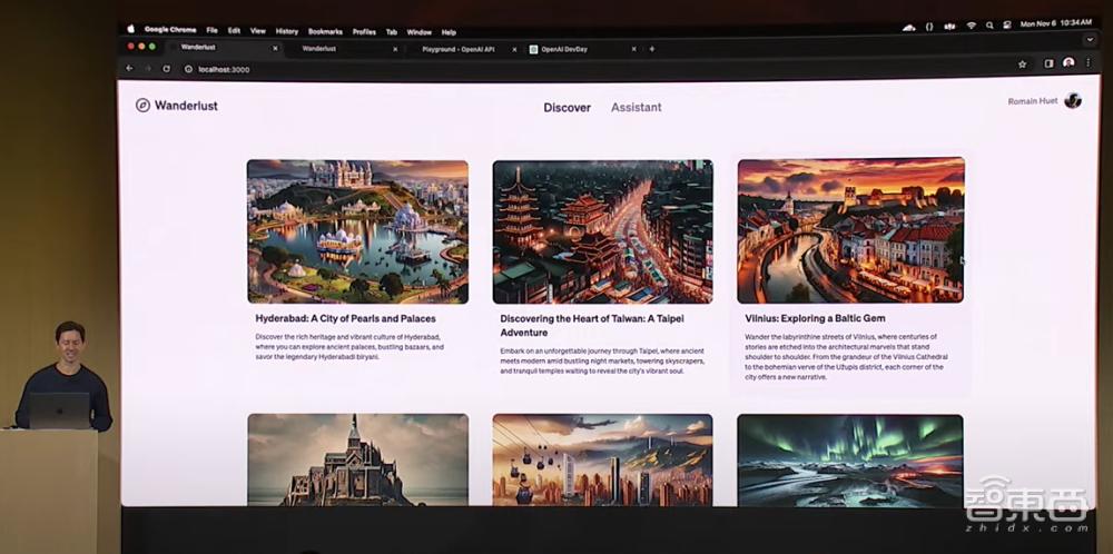 假设需要构建一个旅行应用程序Wanderlust,图中是已经用GPT-4和DALL·E 3生成的目的地列表及风景图。