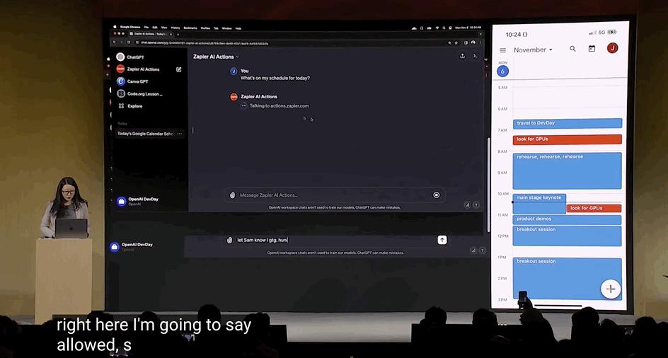 另一个伙伴Zapier已经构建了一个GPT,允许用户在6000个应用程序中执行操作,集成应用。在其负责人的演示中,当她点击Zapier AI操作开始,问“我能知道今天的日程安排是什么吗?”,定制版GPT就连接了她的日历,提示其在日程上出现了冲突。当提出“萨姆,不,我得(提前)走了”,定制GPT会推出与萨姆通话的选项,以供运行。