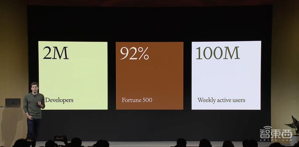 阿尔特曼先回顾了OpenAI过去一年发布的产品进程,截至目前,已经有大约200万开发人员在其API上构建各种各样的应用,超过92%的全球500强企业正使用其产品,ChatGPT的周活跃用户达到大约一亿。