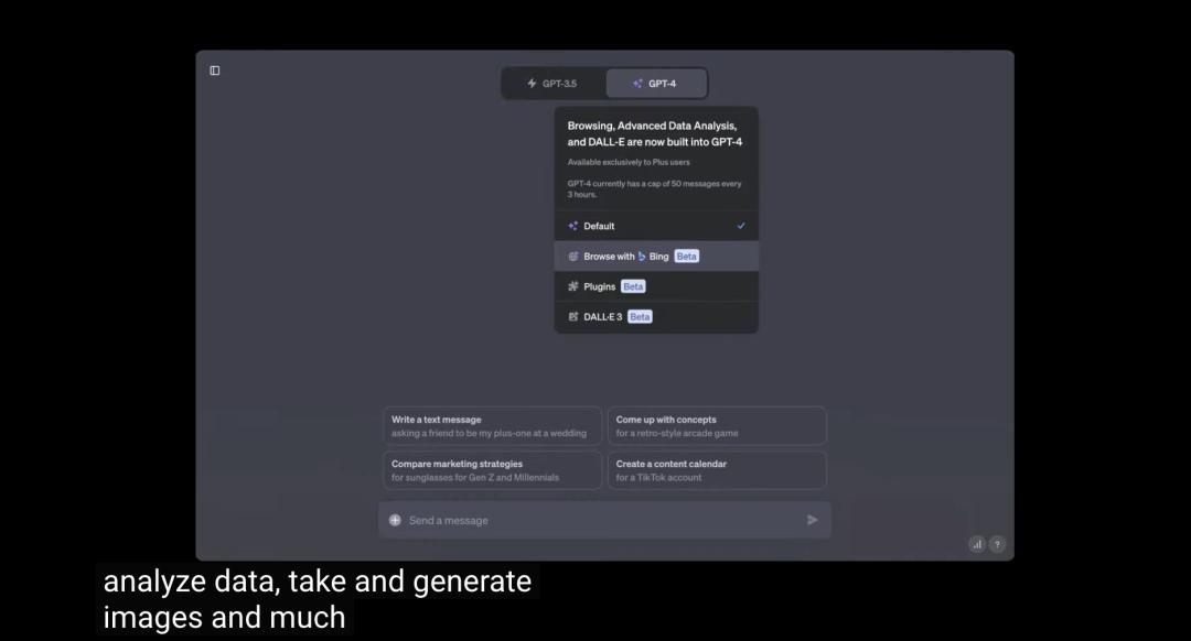 更轻量化的ChatGPT现在使用GPT-4 Turbo,前面提及的GPT-4 Turbo所有六大新功能都将可用。同时,当用户需要编写和运行代码、进行数据分析或生成图像时,ChatGPT现在可以浏览网站。它的使用界面也更简化,用户将不必点击下拉菜单,而是能被体察到什么时候要用它干什么。