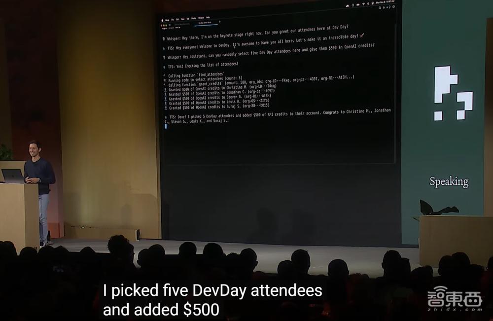 Romain通过手机语音输入,让该助手Whisper与现场与会者打了个招呼。随后,为了调动氛围,他先是让Whisper随机抽取5名“幸运观众”,最后又为现场所有与会者每人提供了500美元的API积分。