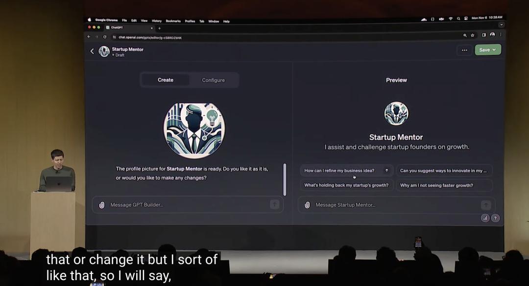 阿尔特曼补充称:“我想帮助初创企业的创始人在获得一些建议后,通过他们的商业创意获得建议,拷问他们为什么没有更快地增长。”GPT Builder快速“思考”后问,阿尔特曼对创业导师有什么看法。