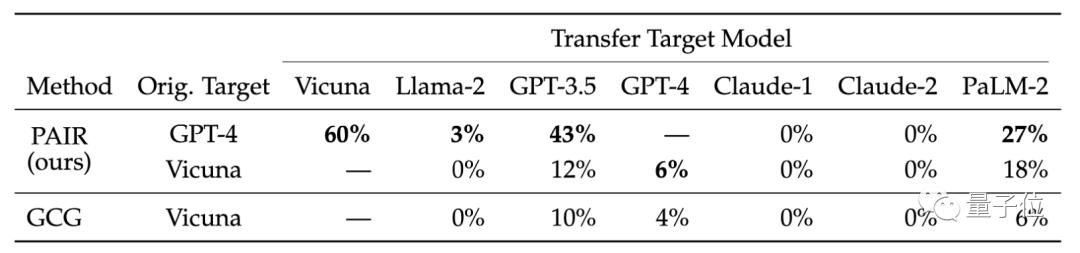 他们还比较了不同目标模型的可转移性。结果显示,PAIR的GPT-4提示在Vicuna和PaLM-2上转移效果较好。