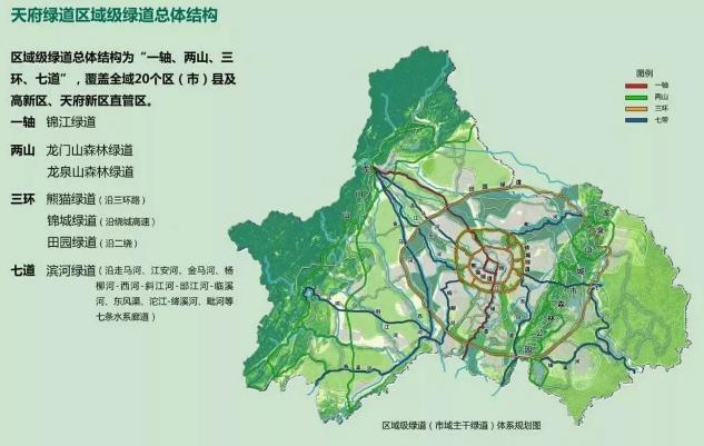 在这幅“千里江山图”上,成都修建了全球最长的绿道体系——天府绿道,把成都平原上的江河、溪流、湖泊、公园、森林、乡村、田园等不同的生态系统串联了起来。根据规划,这条绿道全长将达到16920公里,目前总里程已超过6500公里。全部建成后,天府绿道将包括“一轴、两山、三环、七道”,联结岷江水系和沱江水系,西至都江堰,北至德阳,南至眉山,向东跨过龙泉山,沿沱江直抵资阳市,将“万水千山纵横”的成都连接成一个步行、骑行可逛完的公园城市。
