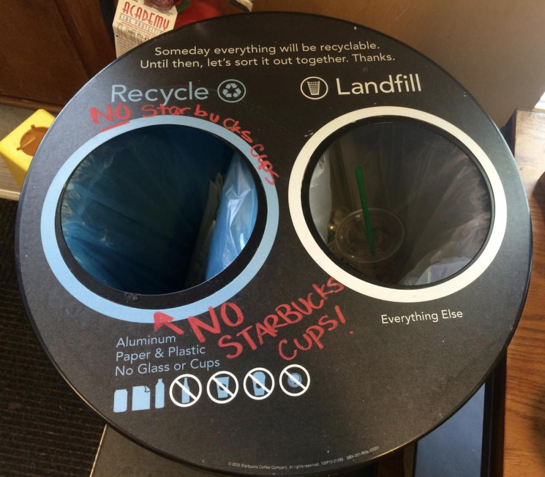 可回收一栏用红字写着:不接受星巴克纸杯|printedpapercup