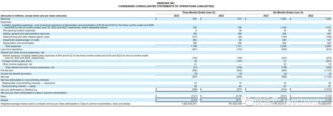 WeWork在2023年第二季度营收为8.44亿美元,较上年同期的8.15亿美元增长4%;净亏3.97亿美元,上年同期的净亏损为6.35亿美元;Adjusted EBITDA为-3600万美元,上年同期的Adjusted EBITDA为-1.34亿美元。