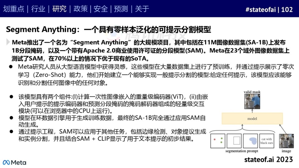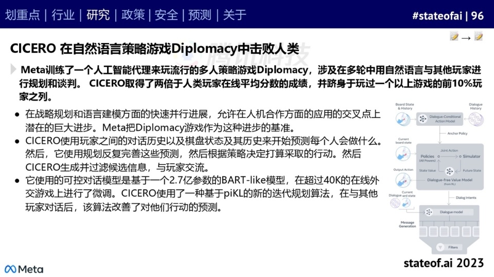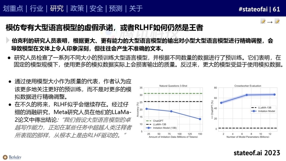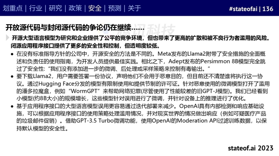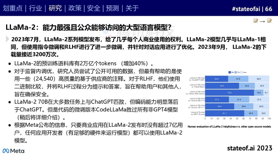 Air Street Capital在报告中指出,当前已发表的关于最先进大型语言模型的技术报告中,都没有包含对人工智能研究人员有用的信息,而一些实验室已经完全停止开发这些语言模型。OpenAI的联合创始人之一甚至将他们最初的开源哲学描述为“完全错误”。相比之下,开源的Meta AI已成为开放式人工智能的冠军,他们的LLaMa模型家族是目前最强大的公共可用替代方案。