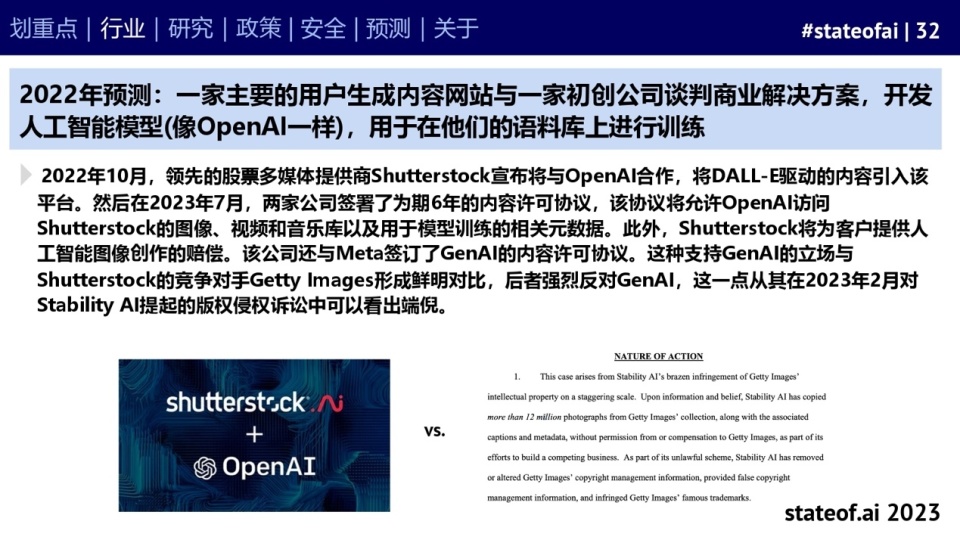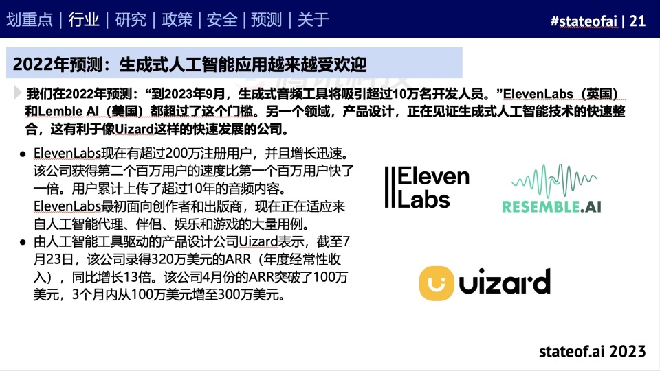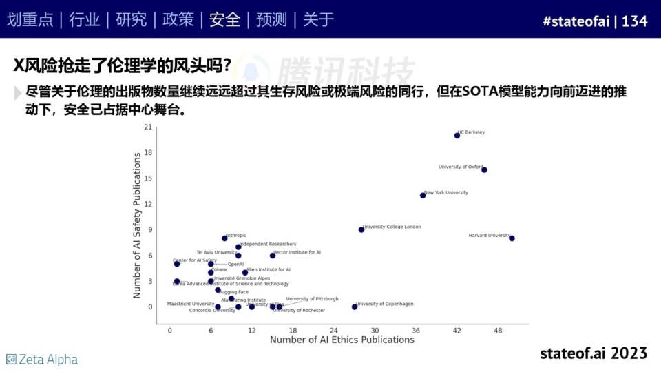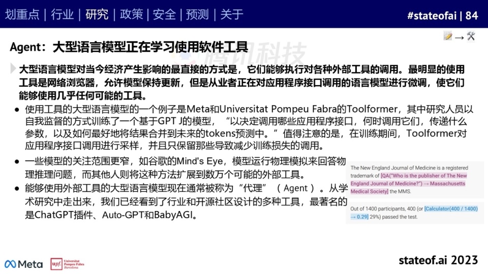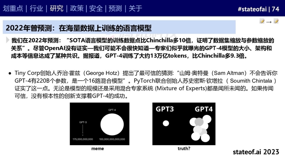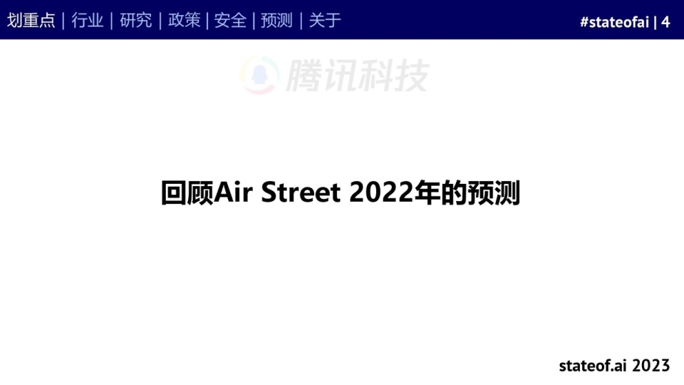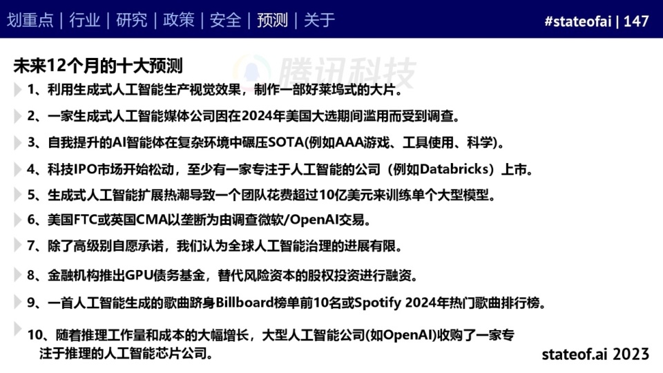 腾讯科技讯 专门在AI领域进行的风投公司Air Street Capital日前发布了《2023人工智能现状报告》。这已是这家风投公司连续第六年发布该报告,今年长达150多页的报告涵盖了人工智能研究、行业、安全和政治方面的内容,并对2024年的行业动态进行了预测。Air Street Capital去年的预测正确率约50%。