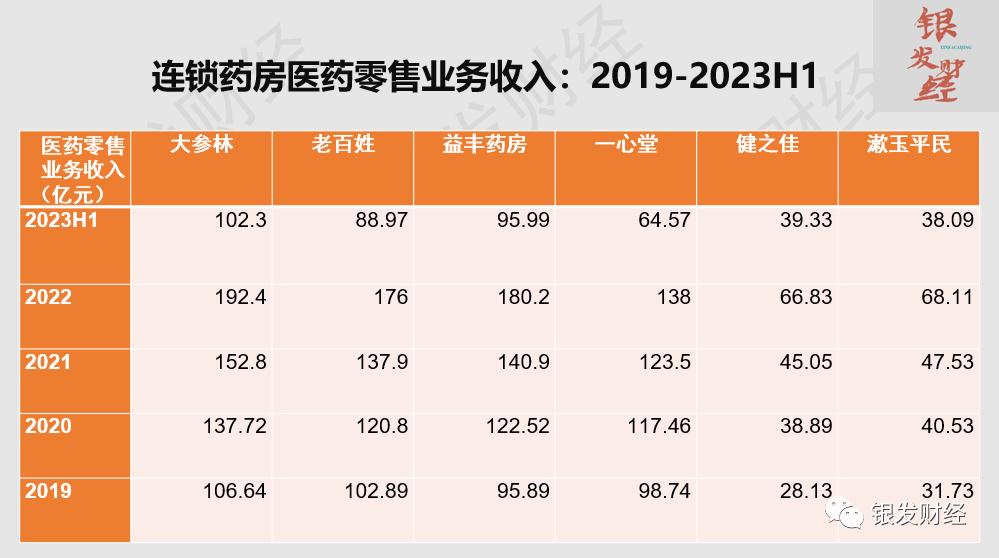 再从自营门店坪效(元/平方米/天)看,过去5年总体增长的有大参林(2019年64.04元,2023H1为72.32元),益丰药房(2019年50.4元,2023H1为54.4元),健之佳(2019年30.42元,2023H1为45.24元),漱玉平民(2019年31.51元,2023H1为46.36元);下降的有老百姓(2019年56.14元,2023H1为55.49元),一心堂(2019年40.1元,2023H1为36.73元)。