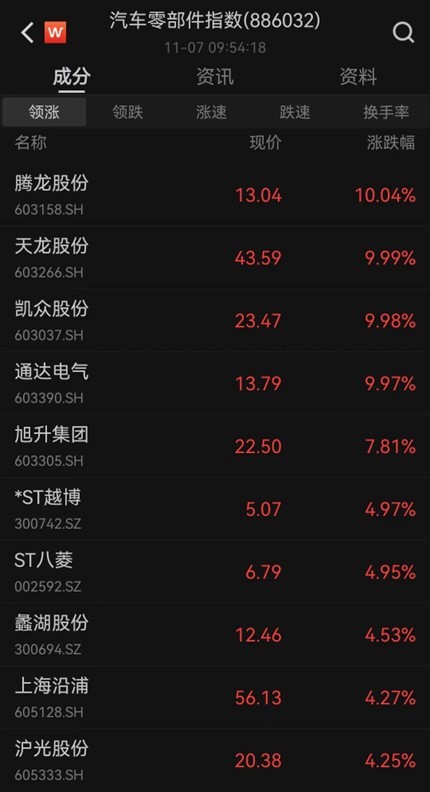 汽车产业链持续活跃,天龙股份10连板,通达电气5连板,凯众股份9天5板,旭升集团、腾龙股份触及涨停。