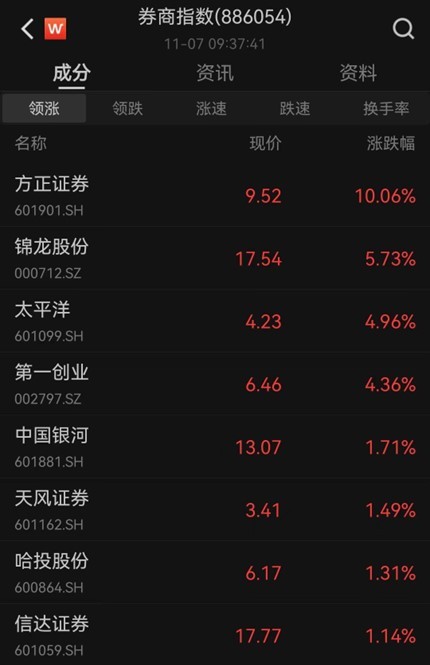 券商股早盘冲高,方正证券2连板,锦龙股份、太平洋、第一创业等继续冲高。
