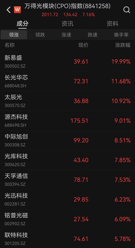 CPO概念股持续走强,新易盛20cm涨停,中贝通信此前封板,兆龙互连、中际旭创、天孚通信、太辰光、光库科技等涨超10%。