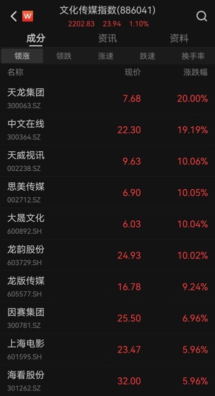 以短剧为首的影视传媒股持续活跃,天威视讯、龙韵股份4连板,中文在线、引力传媒、因赛集团、天龙集团、思美传媒等继续冲高。